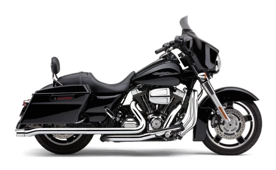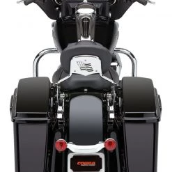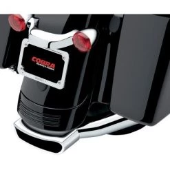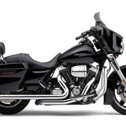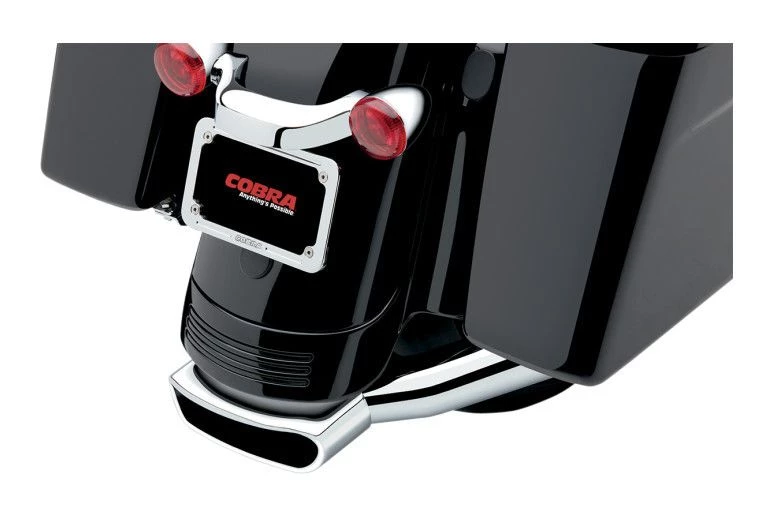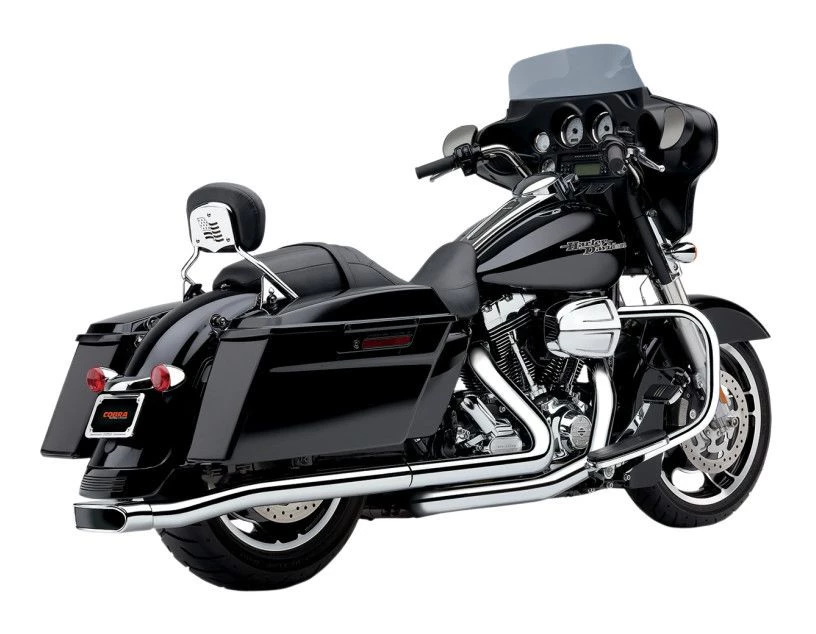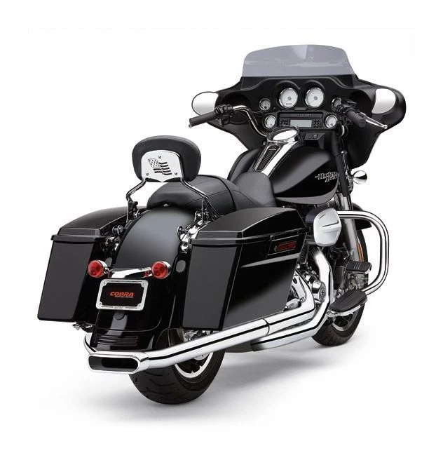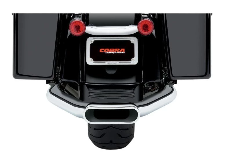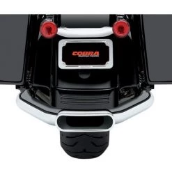 The Center-Pro is a whole new way of looking at slip-on mufflers. Unique U-shaped exhaust easily slips on to stock head pipes or Cobra’s Power Port duals. Unique 2-into-1 design and an industry first where both mufflers join at the rear beneath the fender for center port exhaust location with superior performance. A single polished unit with a black or chromed steel exhaust tip finished with a perfectly rolled edge.