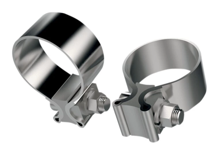 - Feature a 1.25″ wide stainless band with an exclusive reaction block for 360° clamping without muffler or header distortion