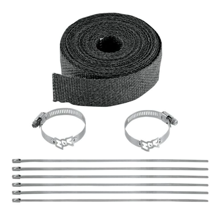 Kit features laser-cut Vance & Hines wrap clamps, header wrap heat tape and locking stainless steel ties. Fiberglass composite wrap helps lock in heat while reducing radiant heat approximately 50%. Kit includes enough exhaust wrap to thoroughly cover two motorcycle header pipes.