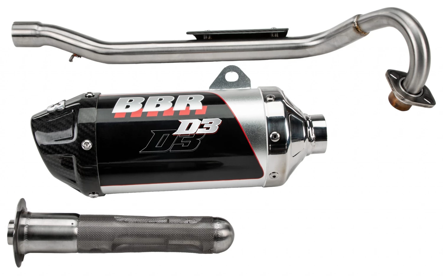 The absolute highest quality performance pit bike/play bike exhaust system on the market – the next generation in D-Section exhaust systems, the D3. This design incorporates an aircraft quality stainless steel header and mid-pipe that have been tuned specifically for each model to optimize performance and power gains. A lightweight “D” profile muffler is used to dramatically reduce weight on all models. BBR’s unique “D” muffler also allows for maximum tire clearance and packing volume. If your neighbors aren’t fans of your pitbike’s new voice, BBR offers a Cancel Core dB reducing insert to keep the HOA out of your hair. Â
