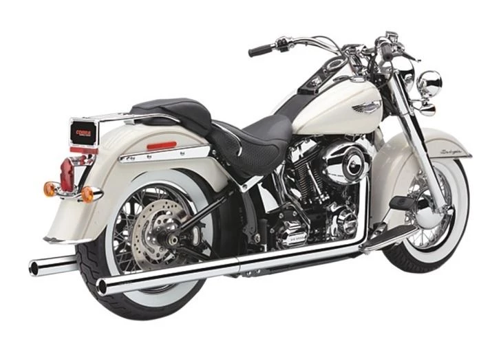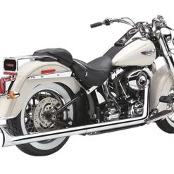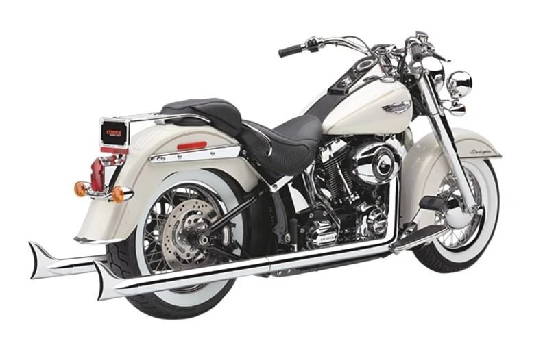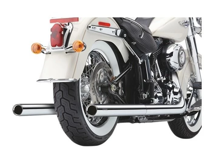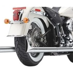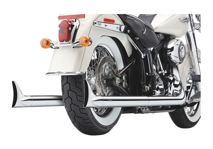 Provides a classic dual-exit look while increasing performance. The 1 3/4″ exhaust tubing provides improved exhaust flow while the removable louvered baffles increase back pressure and torque. The rear head pipe is not flattened to clear the coil bracket. The fishtail-style tips sticks out 6″ further than the standard billet tips for a more custom look.
