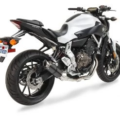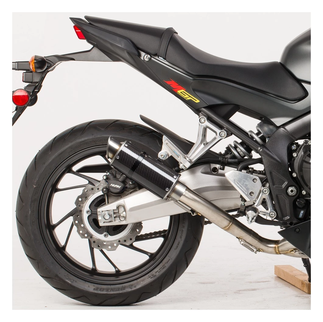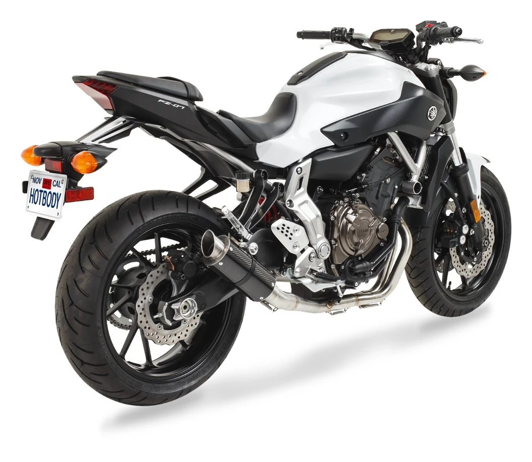 This exhaust system from Hotbodies Racing is a quick and easy way to give your ride that MotoGP look. This low profile pipe is lighter than stock and bolts right up to your OEM exhaust’s location with zero modifications. In addition to making your bike look the part, this system will give your bike a loud and aggressive exhaust note that would make any race team proud.Â