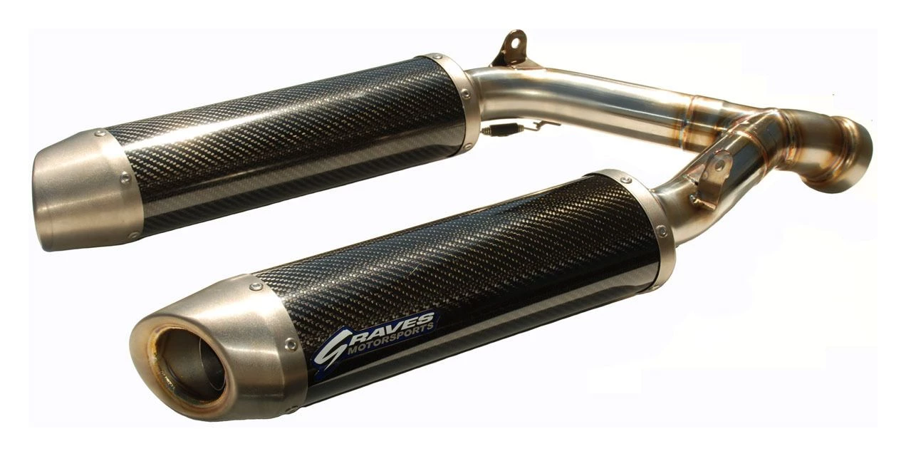 Graves Slip-On Exhausts are designed for the rider seeking top of the line performance, fit, finish and value. Developed using the same technology that has powered the Monster Energy Graves teams to consecutive AMA Superbike championships, the Graves Everlast packing produces an exhaust note like no other and holds up longer to the extreme conditions of a high-revving motorcycle. Graves incorporates advanced welding processes to reduce oversized welds that can cause excessive heat buildup. A special pipe bending technique known as mandrel bending is used for all Graves exhausts to prevent wrinkles and ovalization of the exhaust pipes. All of this combined not only streamlines the appearance of the exhaust systems but saves significant weight over the stock exhaust!