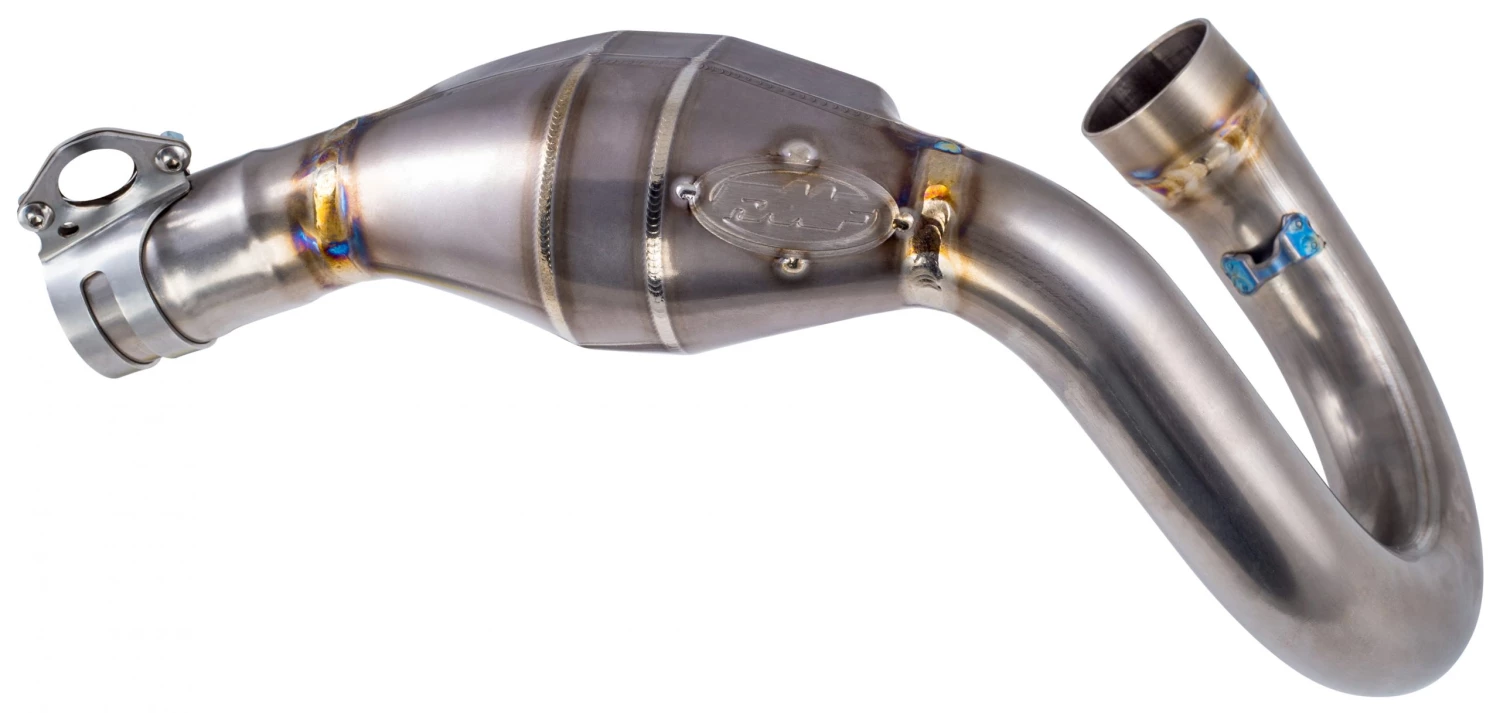 The FMF MegaBomb Plus header is the top choice for many Factory Teams and is best suited for Motocross, Supercross and GNCC style riding where more bottom to low end response is desired. The patented header design allows exhaust gasses to expand, cool and ramp back up at a higher velocity. This results in torque gains typically associated with longer headers, and the healthy over-rev of a short header. When combined with an FMF Racing Slip-on Muffler, gains of up to 3 horsepower can be achieved with a stock motor. Not only does the MegaBomb offer more usable power, it also acts as a pre-muffler and can lower noise levels by as much as 1.5 dB.Â