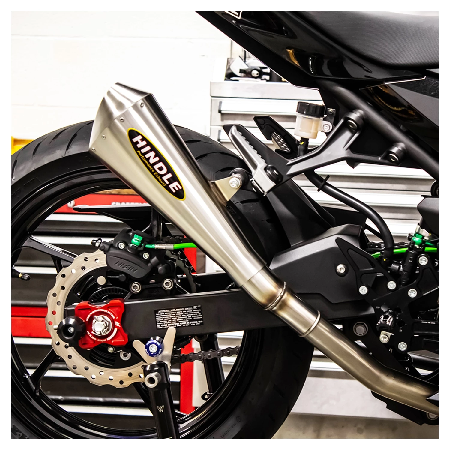 The EVO Megaphone Slip-On Exhaust from Hindle is a great way to decrease weight and increase power without having to break open the piggy bank. Over 35 years at the track has given Hindle all the experience they need to make top level exhausts for the street.Â