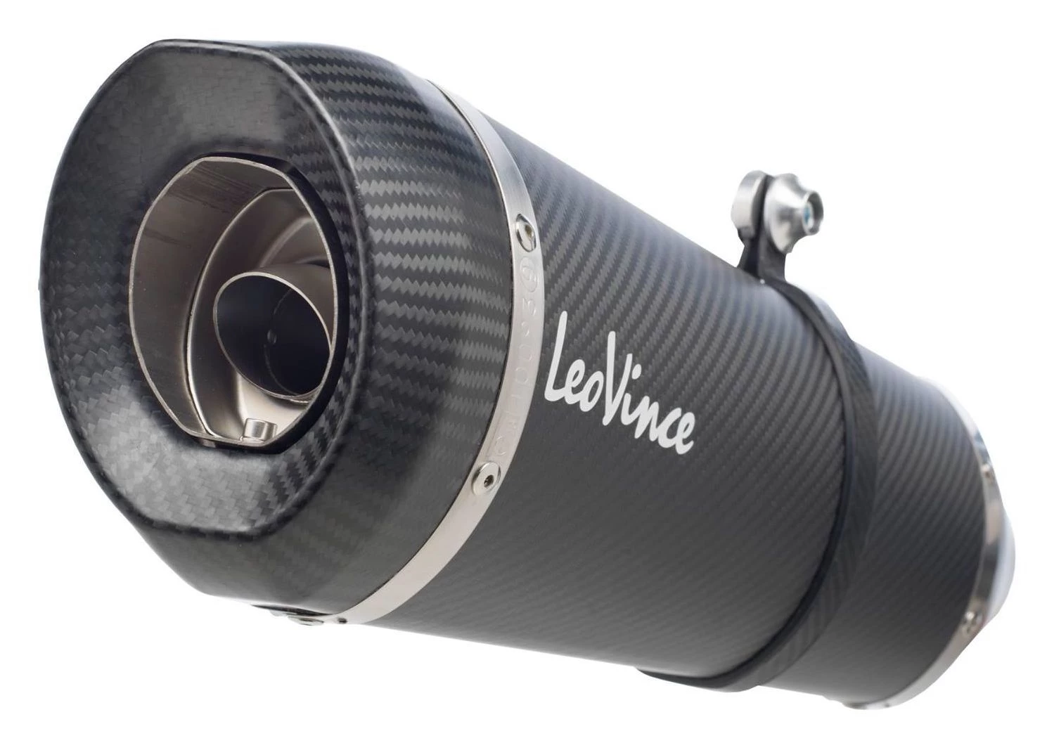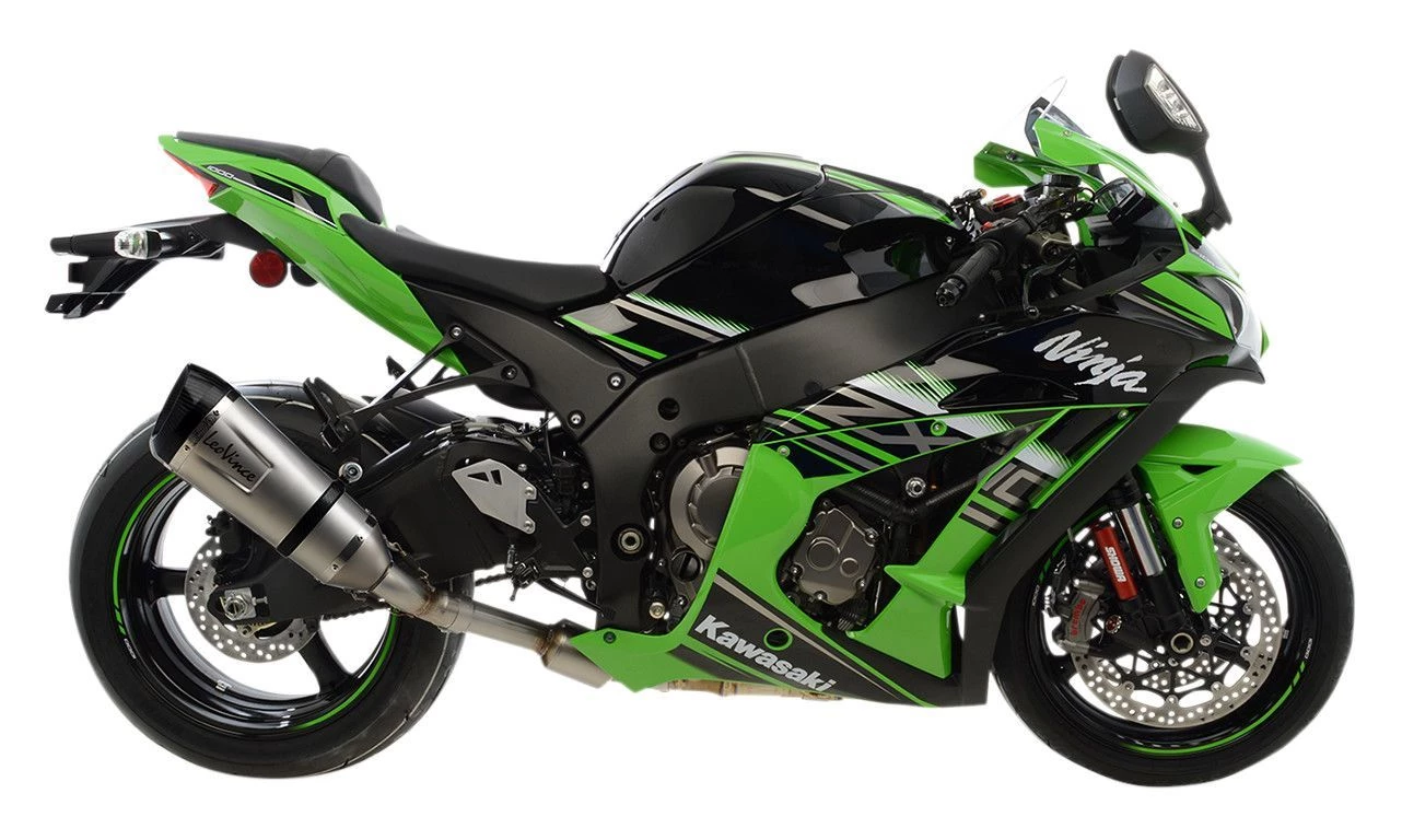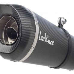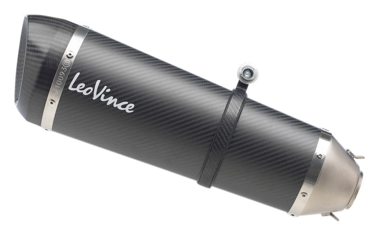 Two options are available for most models: stainless steel and carbon fiber. The stainless steel option incorporates high-quality AISI 304 stainless steel with an laser etched Leo Vince Logo. LeoVince exclusively uses 304 stainless steel for its thermal and high corrosion resistance and welding characteristics. The steel is then put through a sandblasting process that produces a distinctive titanium-like finish. The carbon fiber option features a flat finish with a contrasting aluminum die-cut Leo Vince logo. Combined with the carbon fiber end-cap makes this a sharp and stealthy performance package. Both options will drop significant weight from your motorcyle further increasing your power to weight ratio.