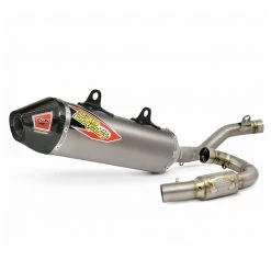 The Pro Circuit Ti-6 Pro Titanium Exhaust System was designed for professional racers competing in AMA Supercross or AMA Motocross to ensure they gain as much power as possible while meeting the specific AMA/FIM sound requirements. The Ti-6 Pro Titanium Exhaust is pounds lighter than most stock systems and is constructed of titanium throughout the head pipe, mid pipe, and canister while the end-cap is carbon fiber.