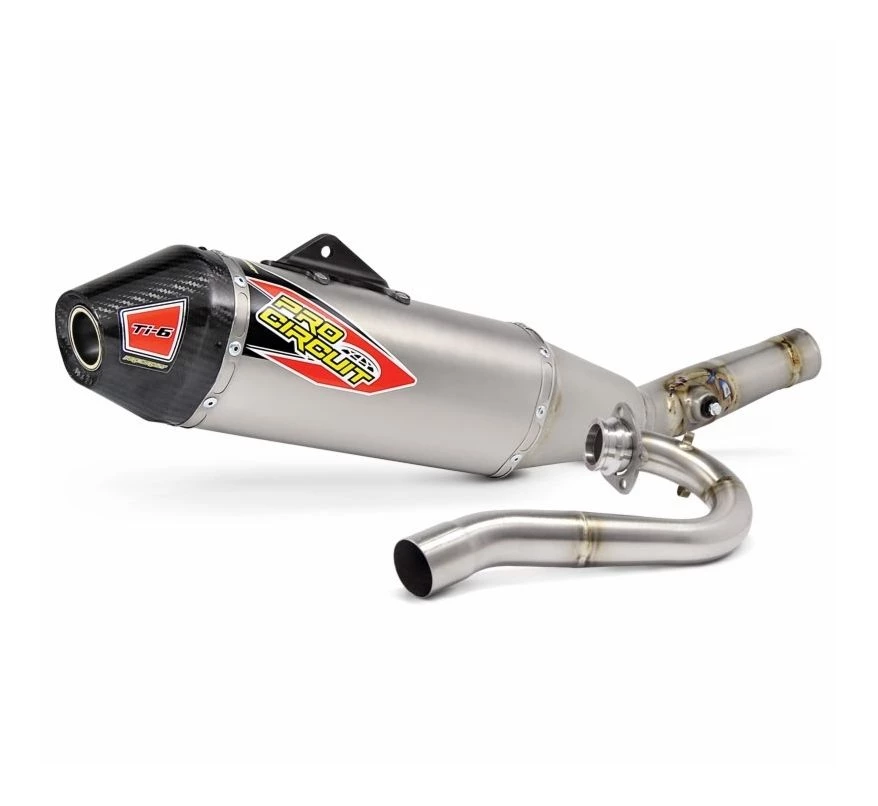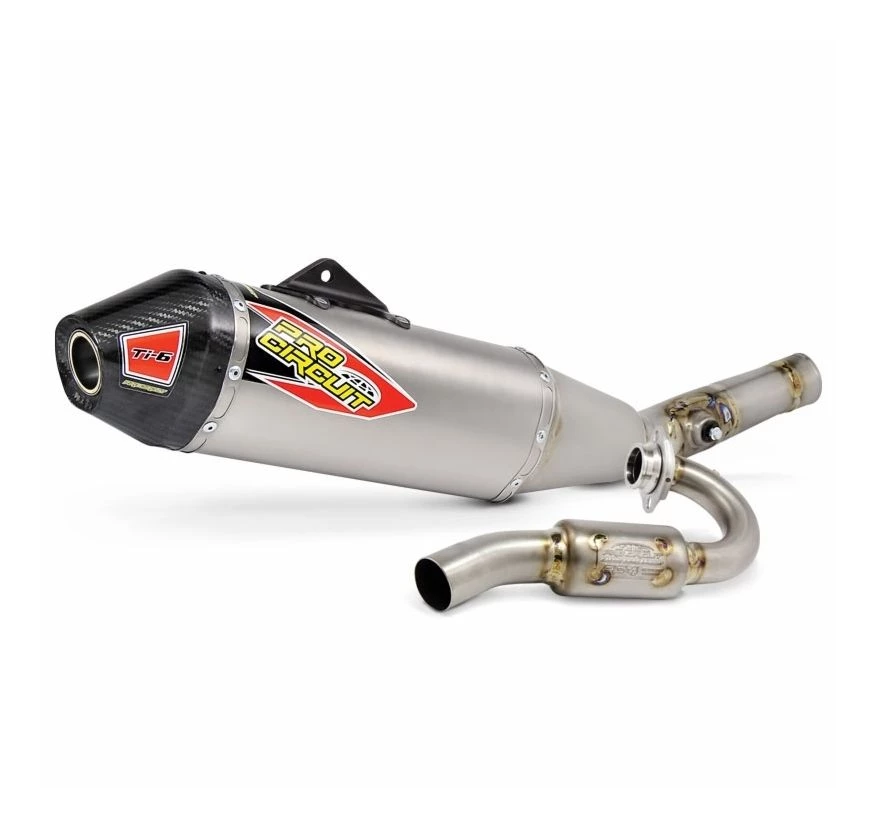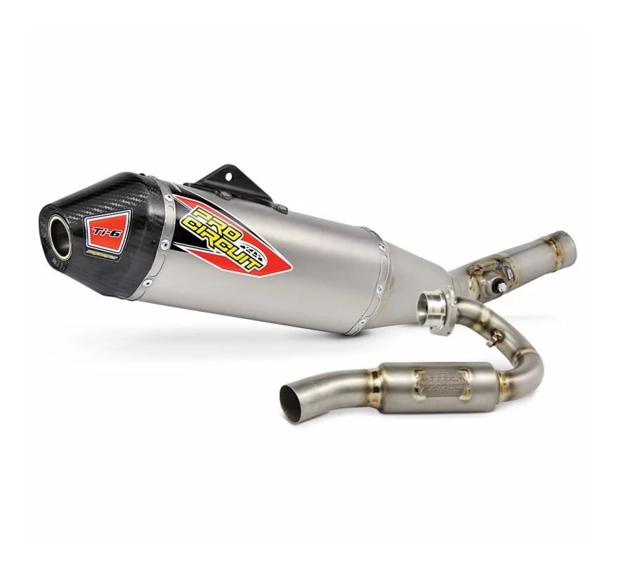 The Pro Circuit Ti-6 Titanium Exhaust System is designed to improve performance throughout the entire rpm range and is constructed of a titanium head pipe, mid pipe, and canister with a carbon fiber end-cap. The Ti-6 Pipe is ideal for any closed-course or off-road racer looking for improved performance, durability and a professional look.