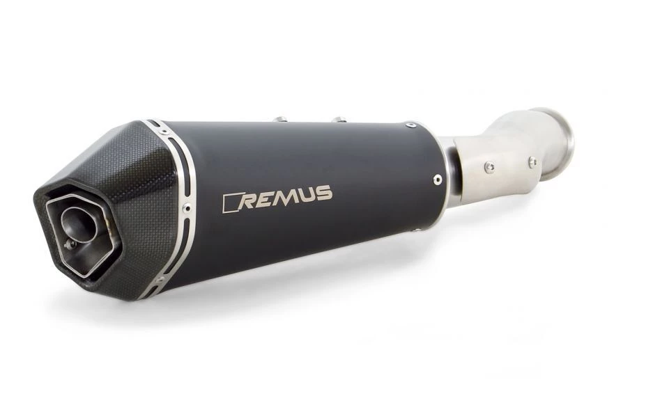 The innovative highlights of the Remus Hypercone Exhaust are the carbon outlet cap with a titanium or stainless steel sleeve. The hexagonal design of the outlet cap and the conical silencer body guarantees maximum ground clearance while cornering.