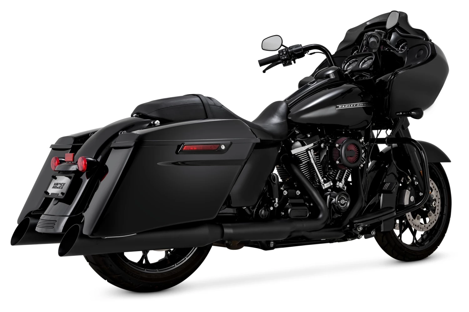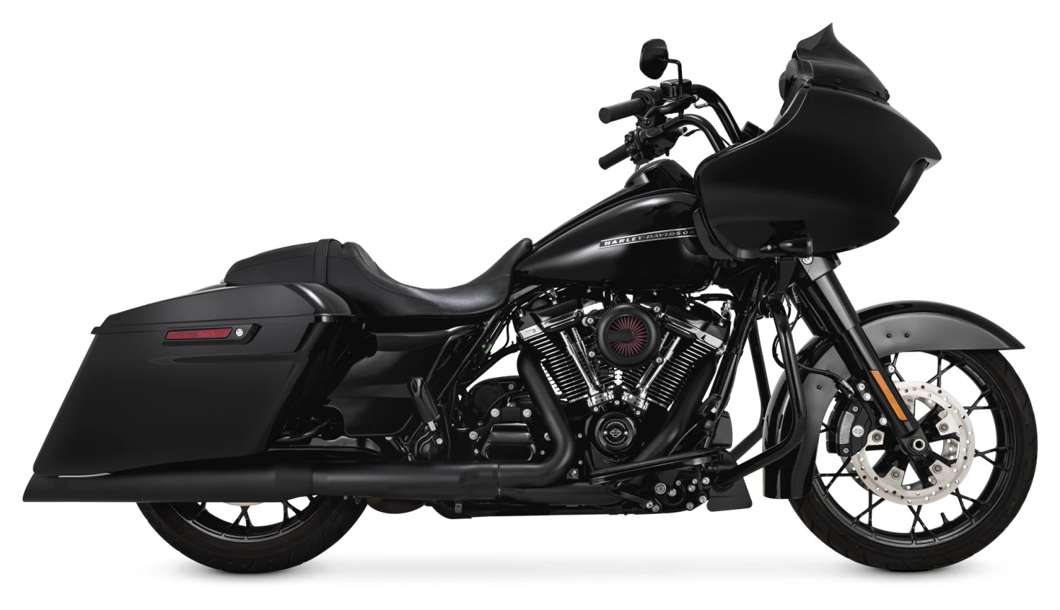 The Backslash 450 Slip On Mufflers from Vance and Hines deliver sound and performance all in a stealth style package. These 4.5″ spin formed slip-ons are designed to match the cut of the extended bags on Harley touring motorcycles. Whether you are running the stock M8 header or upgrading to a pair of Vance & Hines Power Duals, the Backslash 450 will fit like a glove and provide the sound and performance that you are looking for!