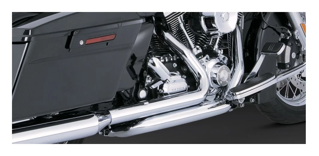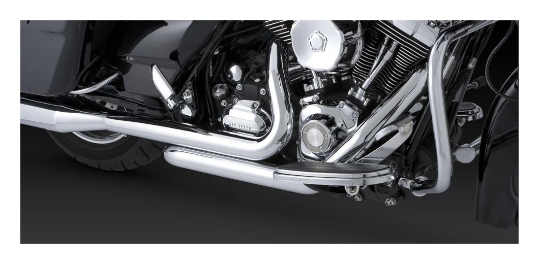 Dresser Dual head pipes give your motorcycle the traditional look, sound, and performance you want. With 220° full-coverage heat shields concealing its commanding 1-3/4” head pipes, you get blue-proof performance for miles and miles. In their newest form, the Dresser Duals eliminate the stock header, giving a clean, true dual function for the newer models. The new design eliminates the heat issues on the left side for the passenger and routes the hot exhaust gases below the footpeg to protect vital engine components from heat damage. For the most complete performance package, pair Dresser Duals with any of the Vance & Hines slip-on mufflers.